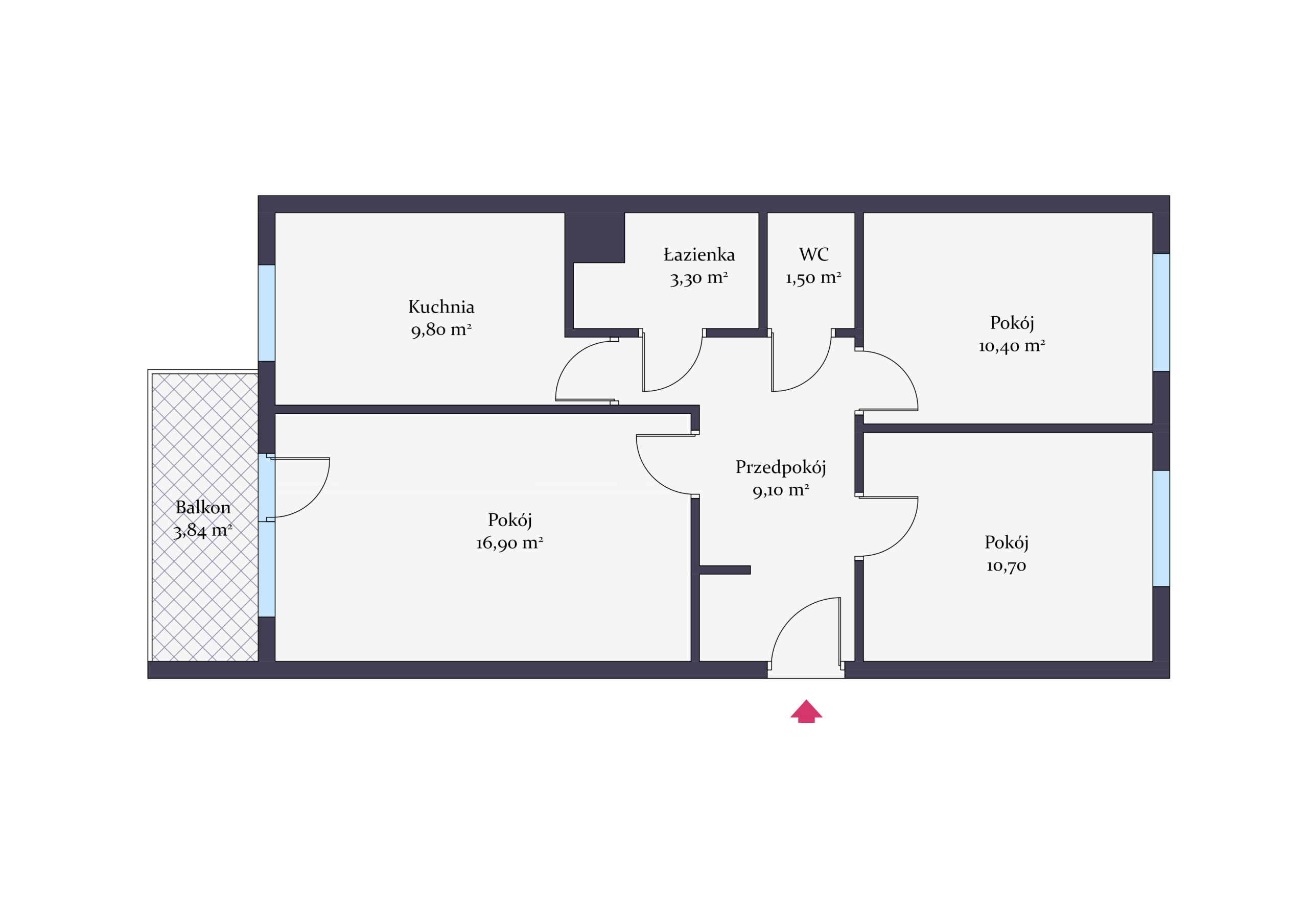 Mieszkanie jest dwustronne, z oknami skierowanymi na północ-południe, co zapewnia doskonałe nasłonecznienie przez cały dzień. Z salonu prowadzi wyjście na balkon, którego podłoga została wyłożona nowoczesnym gumitarasem, zapewniającym trwałość i komfort użytkowania.